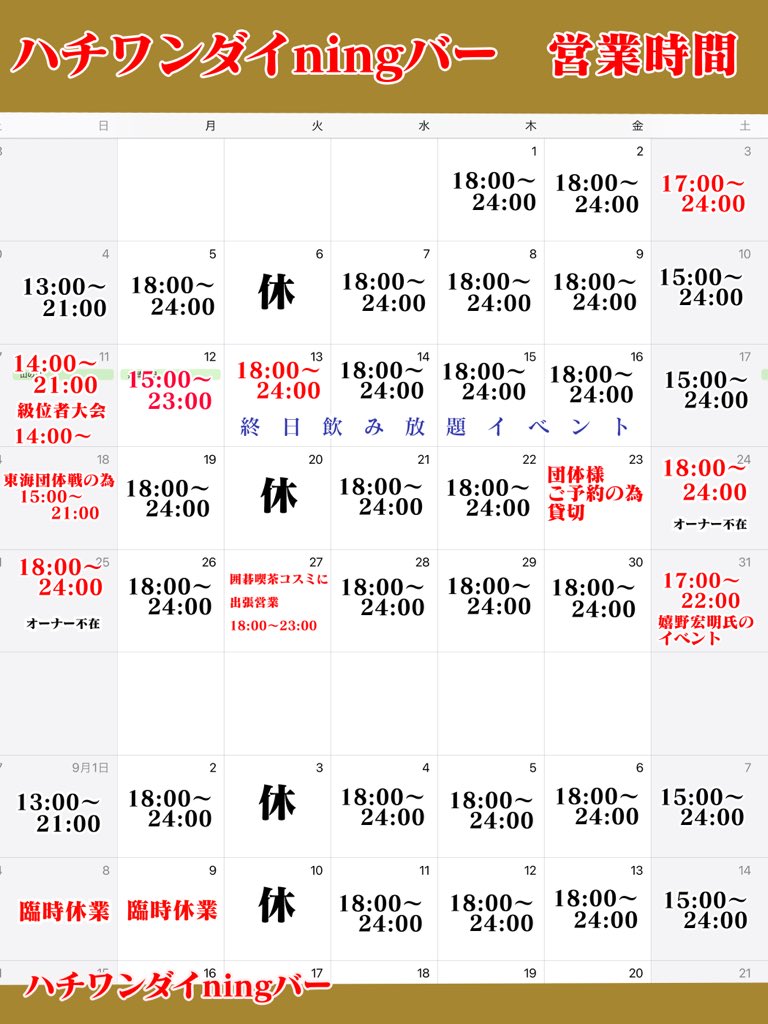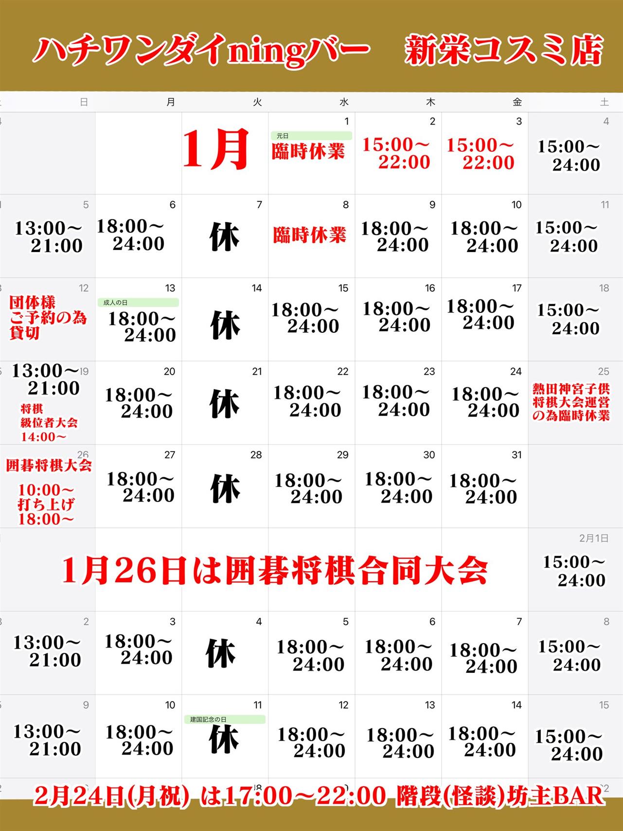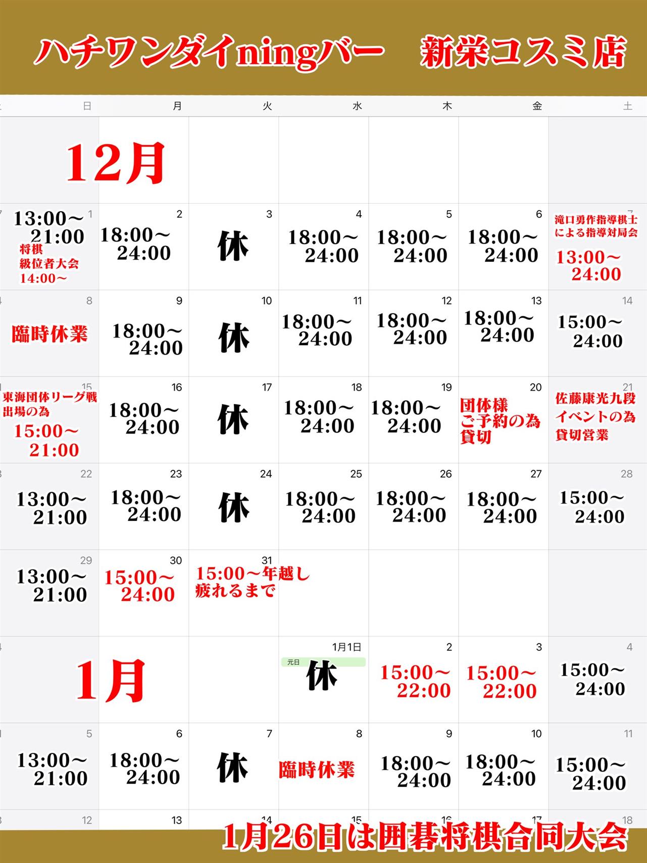 お知らせ news 2024/12/30 新栄コスミ店の2025.1月のカレンダーです。 2024/12/02 ハチワンダイningバー新栄コスミ店 オープン 2024/08/01 8月のカレンダーです more 料金システム price more 将棋のルールかんたん解説 rule more ギャラリー gallery more お客様の声 voice more