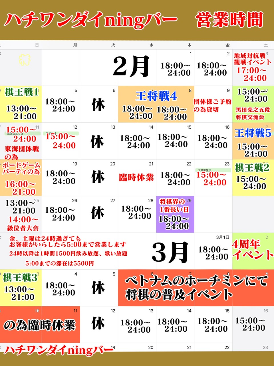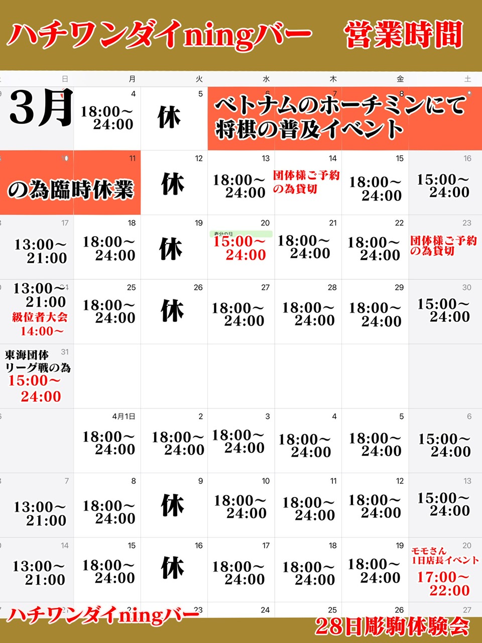 いつもご来店ありがとうございます3月のカレンダーです。ご確認の上お越しください。6日から11日まではベトナム語のホーチミンにて将棋の普及に行ってまいります。