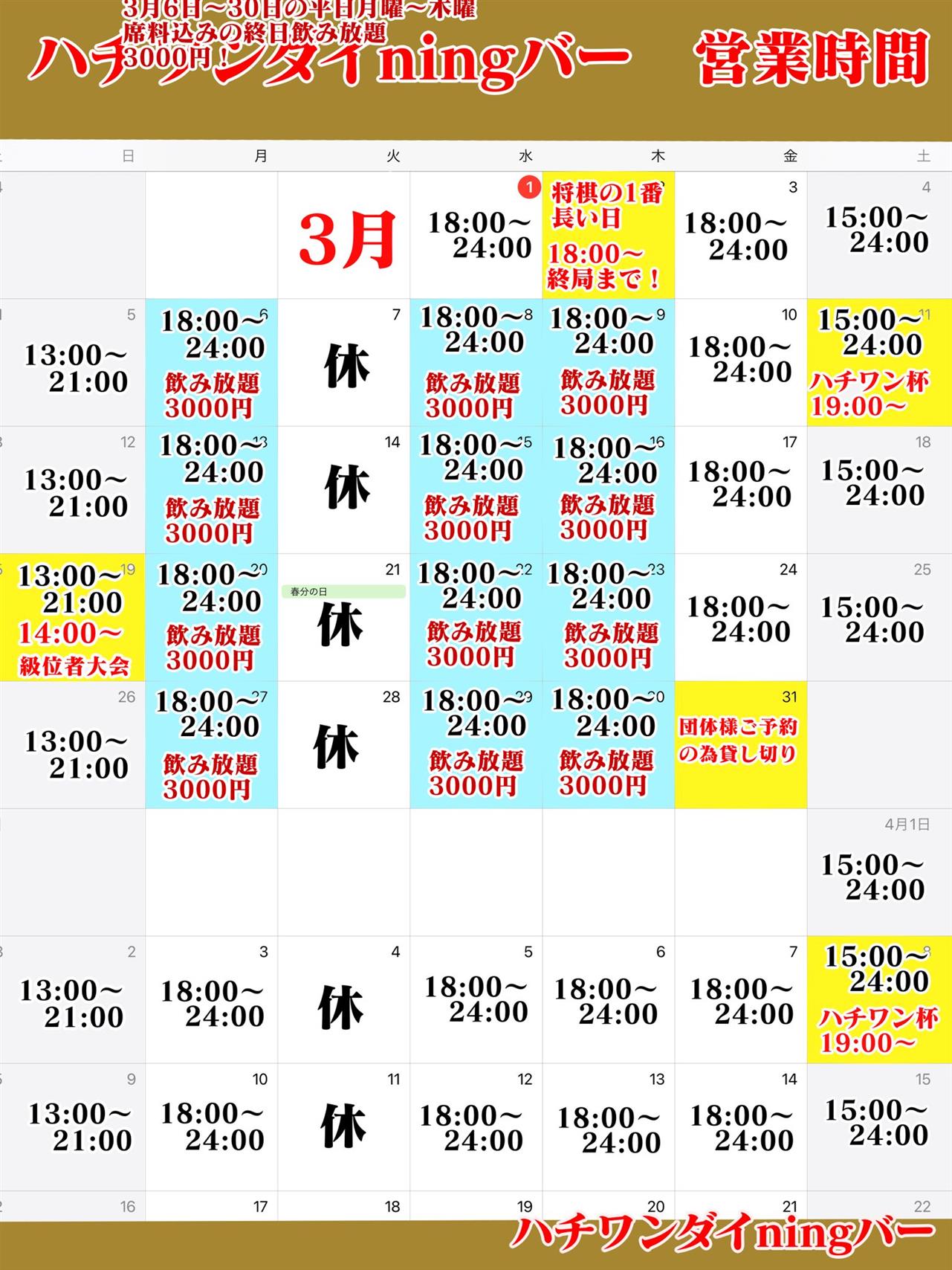 3月のカレンダーです。ご確認の上ご来店ください。