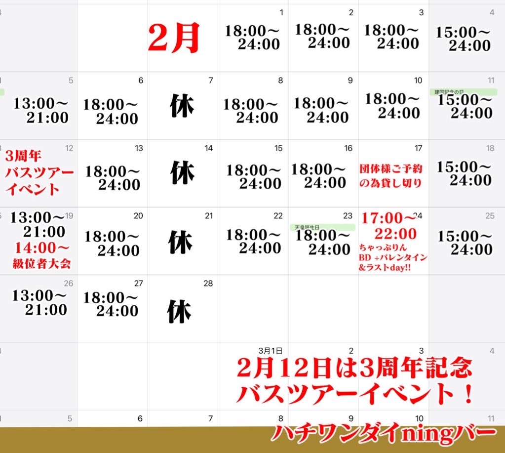 2月のカレンダーです。ご確認の上ご来店ください。