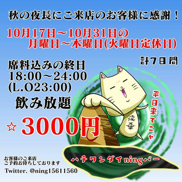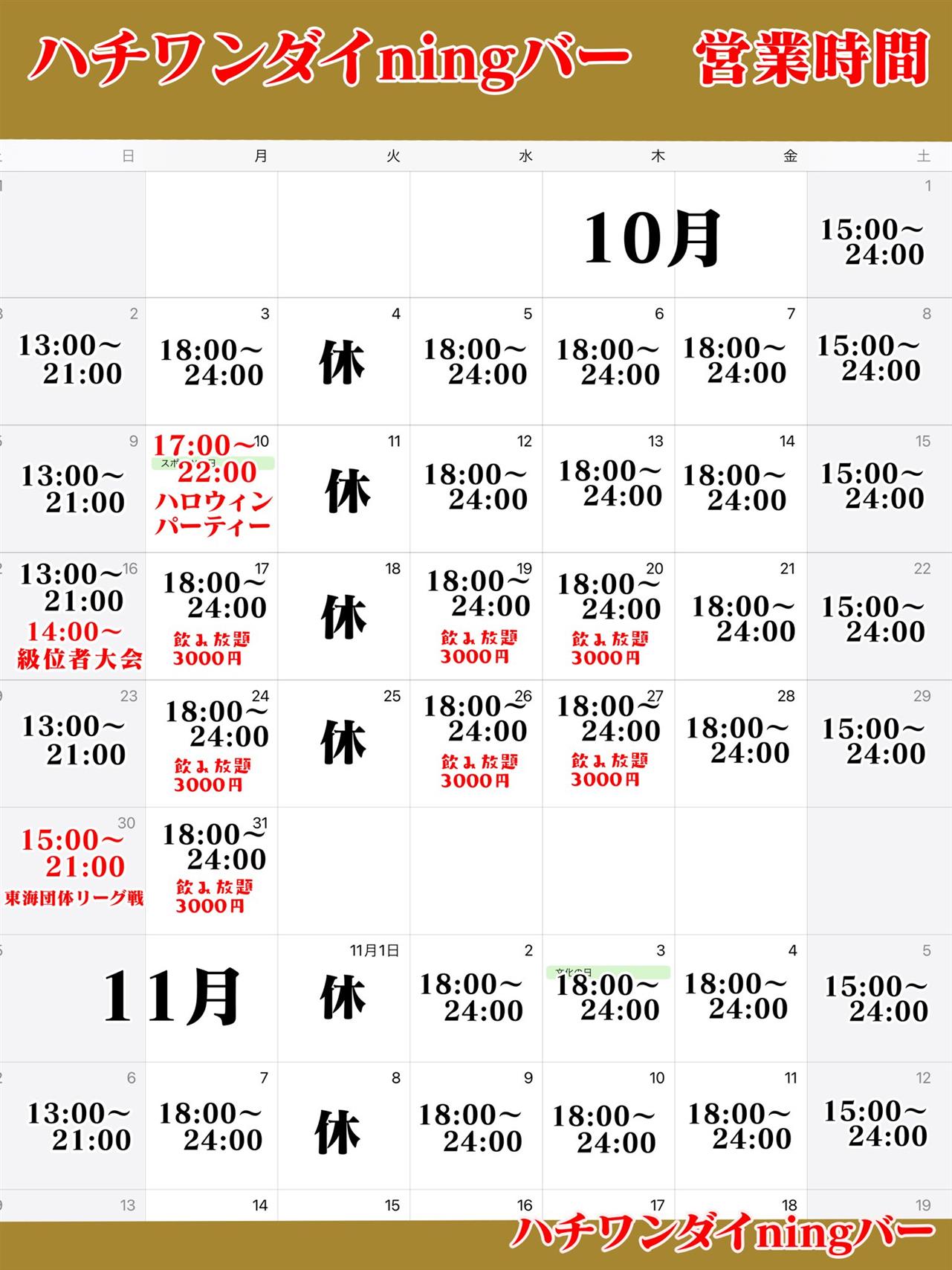 10月15日の土曜日は17時から営業いたします。