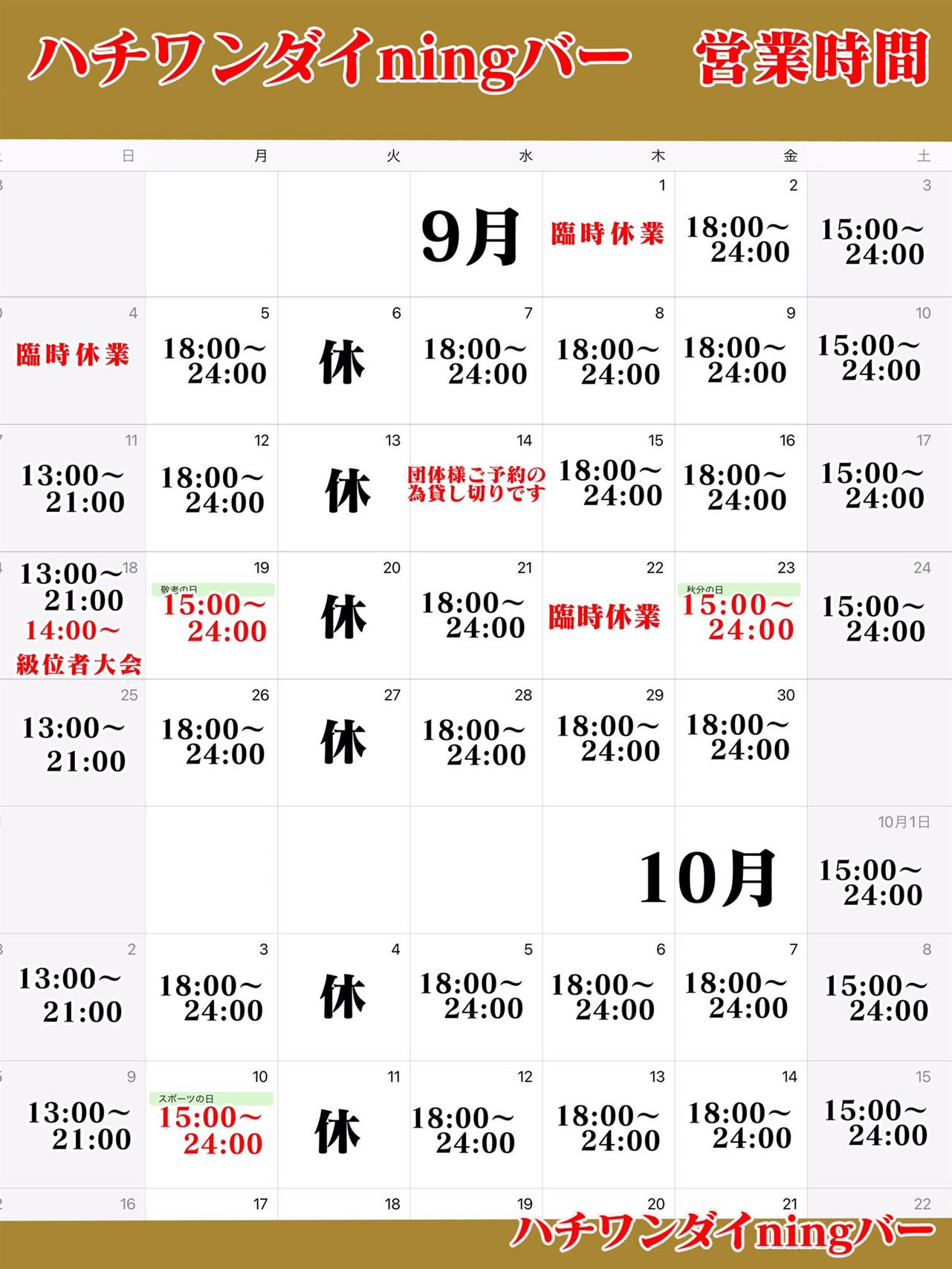 9月の営業時間のカレンダーです。