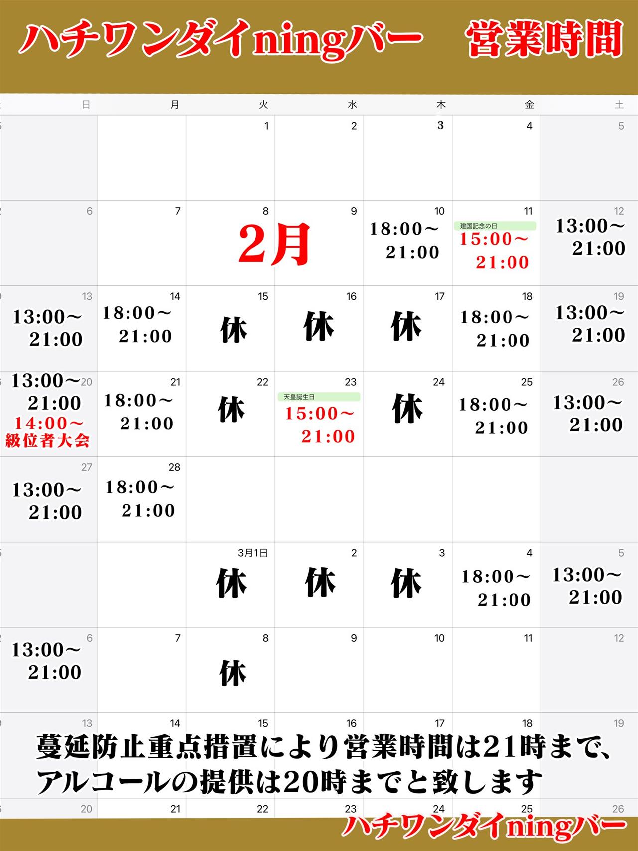 蔓延防止重点措置による、営業時間の変更のお知らせです。